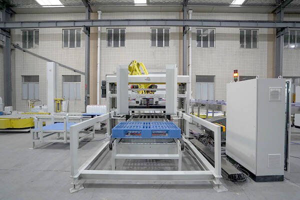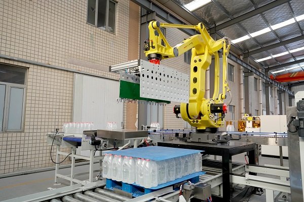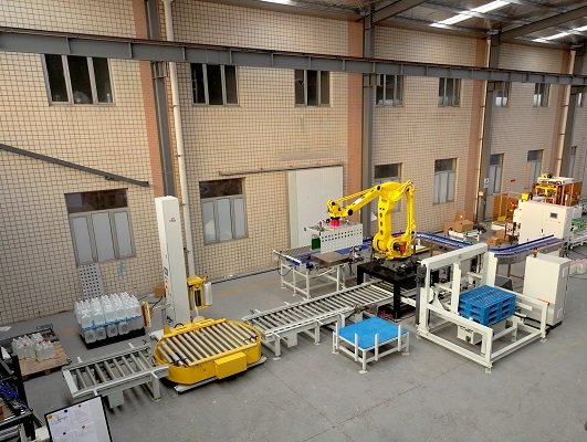 膜包水码垛缠绕包装线是由供栈机、理料线、码垛机器人、垫板仓以及在线缠绕机等设备组成。该线体常用于矿泉水、饮料、啤酒、瓶装调味料等产品码垛使用。鉴于前端罐装产品的效率比较高,码垛机器人采用库卡大负载机器人,同时配以复合式抓手,即可实现一列产品一起抓取,也可以同时抓取垫板,占地面积小,成本低。